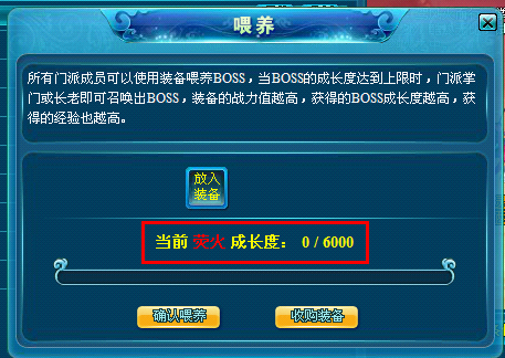 当然,并不是说随便就可以召唤出BOSS来的,而是需要通过对BOSS进行喂养,等到喂养满后才可以进行召唤,大家可以把些没用的装备或绑定不需要的装备放过去进行喂养从而提高玩家的喂养值的。