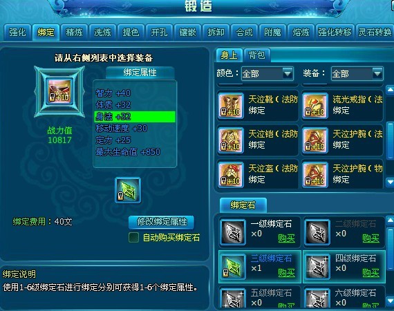 4、装备精练以及绑定属性;装备绑定属性,我想说前边的属性越差后面获得好属性的几率就越大(个人经验感觉^-^)。。关于精炼的一些好的方法和心得。。这方面我也在研究怎么样才能让精炼轻松的上去,如果有了好心得会继续和大家分享的,,