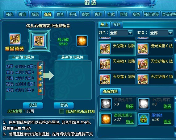 5、装备洗练;这方面就比较容易些了。建议如果不是橙色装备的不要洗练,因为,绿色和白色是3条,紫色或者蓝色获得的属性只有4条,橙色是5条,差别是很大的,一般到了橙色一个高级洗练石就可以获得好的属性了,如果不满意可以用属性锁吧洗好的属性锁住然后再洗别的属性。破甲加到8星是100。这是什么概念就是等于一个蓝色5级破甲法宝。所以装备洗练是很重要的地。