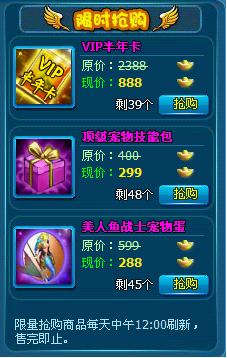 回馈广大天之刃玩家,开服三天内商城将开放五折VIP月卡及6折美人鱼,其中还有7.5折的顶级宠物技能包(可开出宠物群体主动技能)!机不可失时不再来,你还等什么呢?赶快抢购吧!开服第四天后抢购专区里会刷新各种折扣道具,甚至有可能刷新免费道具哦!