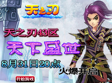 一起来玩8090天之刃吧,8090天之刃双线43服“天下盛世”将于2012年8月31日20点火热开启!丰富的开区活动,精彩的游戏内容,都等着您来参与!赶紧加入8090天之刃,一起打造一个属于我们共同的美轮美奂的玄幻世界!