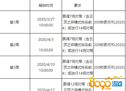 第一周从3月27日的十点钟开始,只要大家可以赢得7场对局或者进行14场对局就可以获得200银河币
