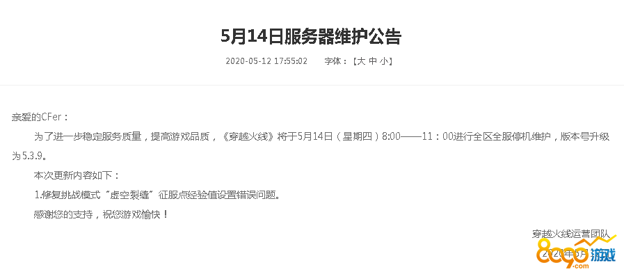 搜索"8090网页游戏"CF在5月14日进行5.3.9版本的更新维护,那么5月14日更新维护到几点结束呢?接下来小编就为玩家们带来5月14日更新维护内容介绍,一起来看看吧!