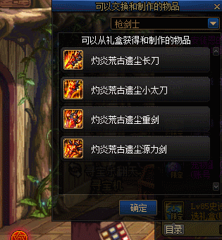 这个是在再战安图恩副本获得的奖励的,这个是有使用的期限的,在7月16日的时候就会被删除的,大家需要在规定的时间之前使用完哦。这个装扮是属于史诗级的武器的,我们来看看DNF灼炎荒古遗尘武器装扮外观展示图,请看下面的图片哦: