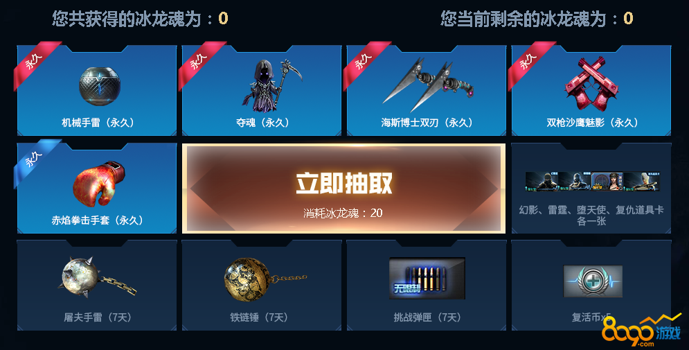 最强版本福利来袭活动中,玩家们在7月23日至8月31日期间玩家完成一局深渊冰龙之巢地图就可以领取30天AK47-冰龙粉碎者,如果玩家已经拥有永久AK47-泰坦破坏者III那么可以直接获得永久冰龙粉碎者。活动期间玩家完成每日任务以及回忆任务可以获得冰龙魂,冰龙魂可以进行道具兑换以及抽奖,兑换内容除了期限道具之外还包括了永久唐刀-盛世太平、永久斩神刀、永久斩魔刀以及永久双龙。活动抽奖奖池中除了期限道具、复活币以及道具卡之外,还包括了永久赤炎拳击手套、永久机械手雷、永久夺魂、永久海斯博士双刃以及永久双枪沙鹰魅影,每次抽奖消耗20冰龙魂。