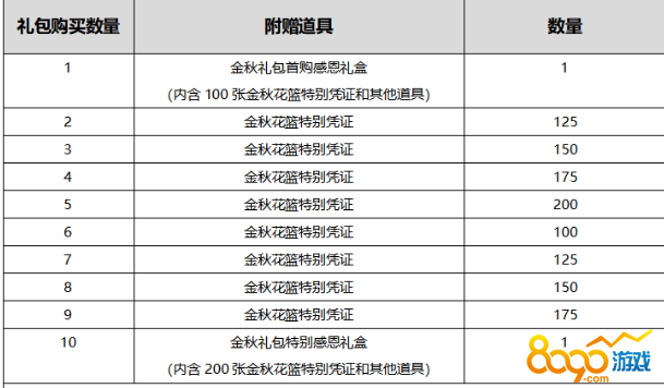 首先我们先来看看买一套的话会得到一个首购感恩礼盒。每个里面有一个7折的优惠券,大家购买下一套金秋礼包的时候可以用上的。详细的买几套送多少个花篮凭证,小编带来的截图哦,大家可以参考一下哦。大家买到第10套的时候可以得到一个金秋礼包特别感恩礼盒,还有特别光环装扮的奖励。大家根据自己的需要决定购买几套金秋礼包就好了,一定要理性氪金。
