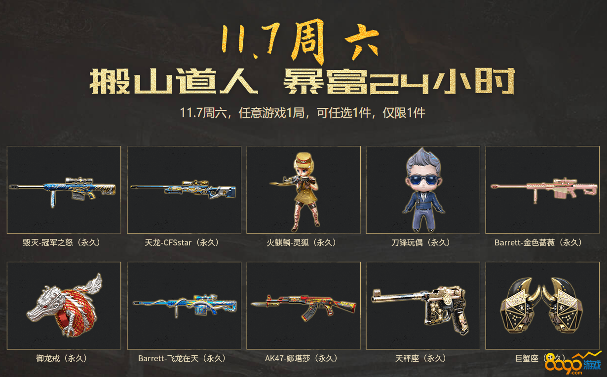 玩家在11.7周六15点,任意游戏1局,即可获得Barrett牡丹(永久)、尼泊尔-炎龙 (永久)、Barrett-苍龙(永久)、尼泊尔英特尔 (永久)等任意一件奖励,玩家在11.7周六任意游戏1局,即可获得毁灭冠军之怒(永久)、天龙 CFSstar (永久)、火麒麟 灵狐(永久)、刀锋玩偶 (永久)等任意一件奖励。