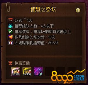 搜索"8090网页游戏"现在地下城与勇士的游戏比较的火热,很多的玩家们都在玩这个游戏,但是在游戏的过程中遇到了一些问题。很多的玩家们都不是很清楚DNF智慧之祭坛一天可以打几次?这个可以几个人一起打呢?需要消耗多少的疲劳值呢?是需要什么样的武器呢?想知道这些答案的宝宝们,快点和小小鱼一起来看看游戏的最新内容吧,速来围观吧~
