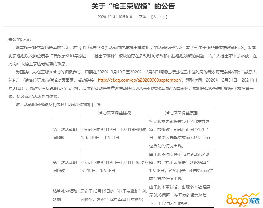 由于之前枪王排位战赛季结算数据出现了一些BUG,所以官网对枪王排位战的活动时间和结算礼包领取时间都进行了延期,枪王排位战已经结束,CF官网也对在9月19日到12月8日期间进行枪王排位战的玩家进行了补偿,玩家可进入活动地址领取感恩大礼包1份。