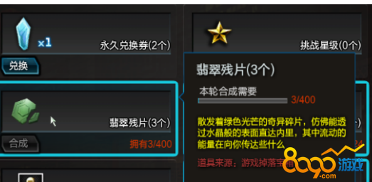 400个翡翠残片 合成以后是个手雷,就是游戏里那个绿色的东西。每天上限15个就很离谱。沙蛇打头,就是吸人的时候头出现血条时候打,然后 狗打吸血管,不大,你一辈子都打不出来。上限才15个,刷几局新图就有了, 一局保底2个,一个BOSS至少给1个。特定打出来的,沙蛇,吸人时候打头,狗打回血管,直接秒BOSS 根本没有。觉得翡翠残片拼的那个手雷可能和炼狱有关系,参考圣人头颅复制体。玩家们只要坚持每天去刷图,刷一一个月左右还是可以合成的,400个碎片还是很容易就收集到了呢。还没有获得碎片的玩家们,快点去刷图获取吧,祝大家好运哦。