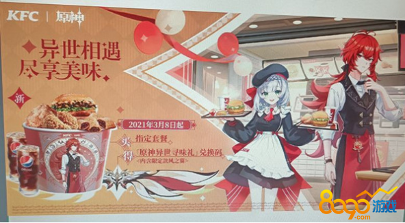 近期有内鬼爆料了一张原神和kfc联动的海报图,从爆料的海报图来看,这是一个线下的活动,将会在2021年3月8日开始,玩家在活动开始之后,去线下kfc购买指定的套餐,就能获得原神游戏的兑换码和限定款风之翼。