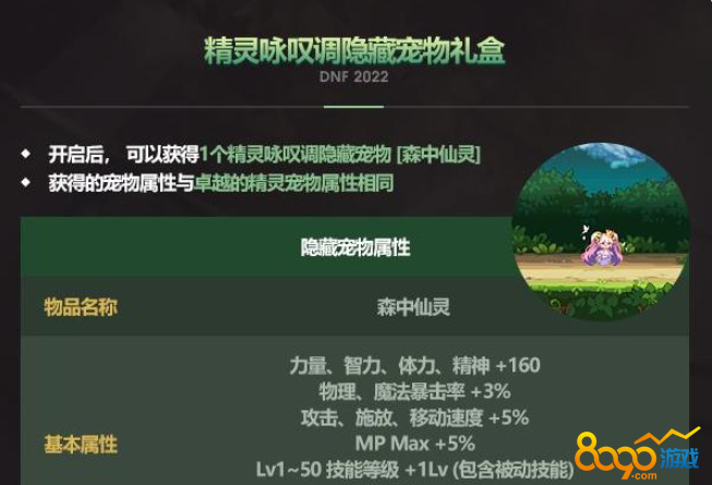 搜索"8090网页游戏"备受玩家们期待的DNF游戏将于5月10日进行一次全区全服的停机更新,随着新版本的更新,dnf官网也迎来了很多惊喜活动,很多玩家都想知道dnf精灵咏叹调隐藏宠物属性是什么?dnf森中仙灵宠物外观怎么样?dnf森中仙灵宠物属性是什么?今天小编就带来dnf精灵咏叹调隐藏宠物属性,感兴趣的小伙伴一起来了解一下吧!
