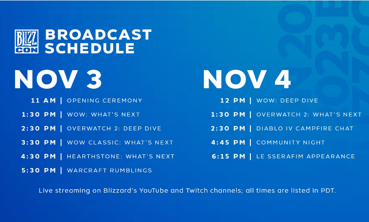 北京时间 11月5日:凌晨3:00—《魔兽世界》深入解析、凌晨4:30—《守望先锋2》未来展望、凌晨5:30—《暗黑破坏神IV》营火座谈、早晨7:45—社区之夜、早晨9:15—LE SSERAFIM 表演