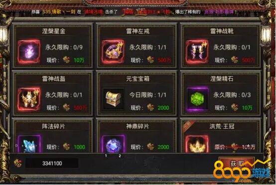 声望商城中提供了各种道具,包括阵法碎片、神鼎碎片、水纹结晶、涅槃精石、涅槃星金等。