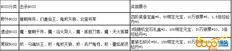 活动说明:活动期间所有玩家均可参加BOSS挑战活动,击杀BOSS除掉落大量装备道具外,更可领取海量奖励,赶快召集小伙伴一起挑战强力BOSS吧!