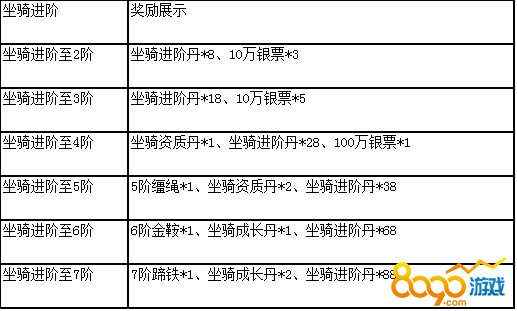 活动说明:活动期间,坐骑进阶达到相应条件,即可领取奖励,坐骑资质丹、坐骑成长丹大放送,机不可失,赶快来进阶坐骑吧!