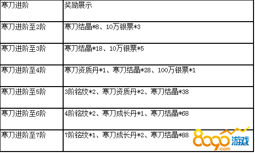 活动说明:活动期间,寒刀进阶达到相应条件,即可领取奖励,寒刀铭纹、寒刀结晶大放送,机不可失,赶快来进阶寒刀吧!