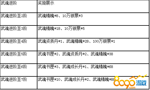 活动说明:活动期间,武魂进阶达到相应条件,即可领取奖励,武魂书匣、武魂精魄大放送,机不可失,赶快来进阶武魂吧!
