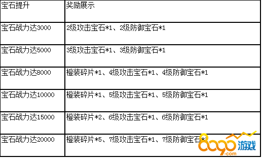 活动说明:活动期间,宝石战力达到相应条件,即可领取奖励,橙装碎片、极品宝石大放送,机不可失,赶快来提升宝石战力吧!