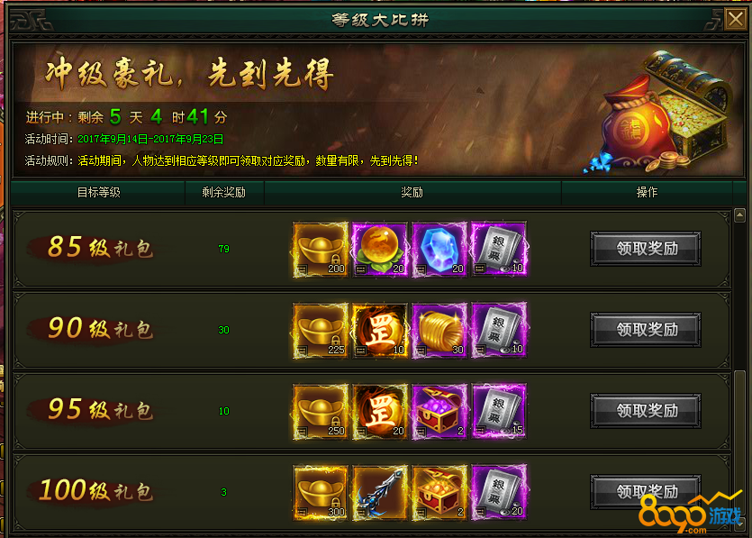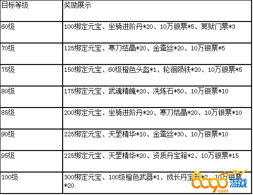 活动说明:活动期间,人物达到相应等级即可领取橙色装备、绑定元宝、进阶材料,数量有限,先到先得!
