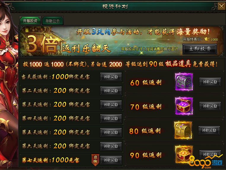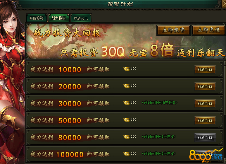 活动说明:战力投资大回报,投资300元宝,8倍返还给您,海量元宝,机不可失!