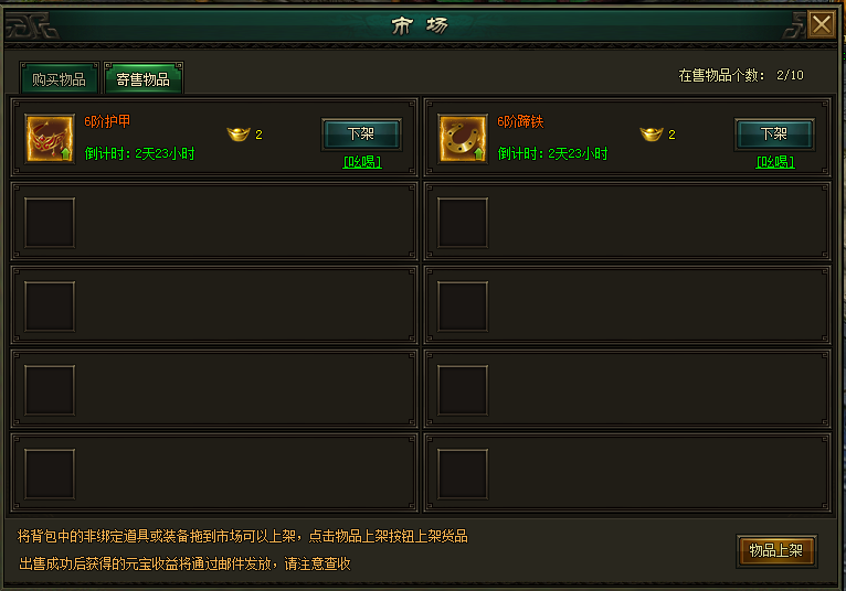 在市场中,玩家不仅可以买到装备,也可以把自己不想要的非绑定的道具或装备放到市场中寄售,物品寄售后,玩家会受到相应的系统邮件。
