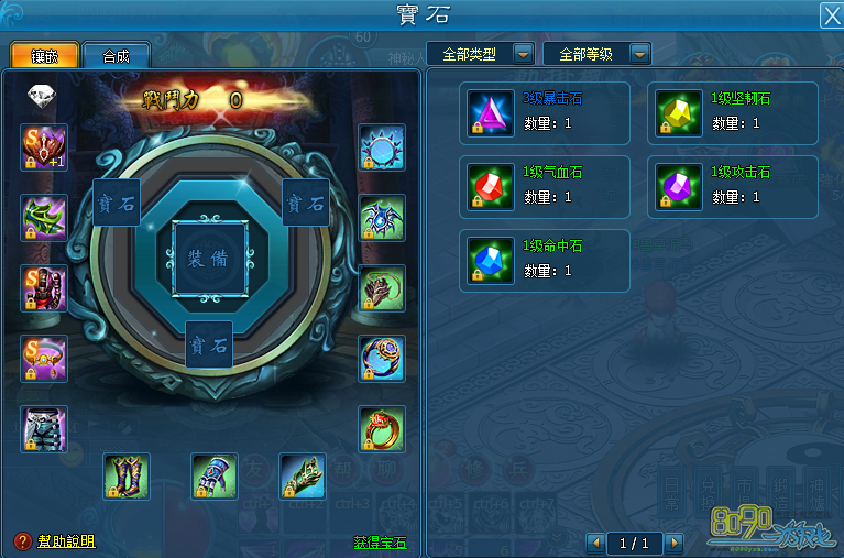 在此界面可以进行宝石的合成操作,没3颗相同等级、相同属性的宝石可以合成一颗相同属性高一等级的宝石,宝石可以通过活动、副本、寻宝等多条途径获得。
