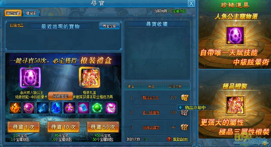 可以在此界面中进行寻宝操作,水晶宫内寻宝需要花费一定的元宝进行寻宝,一键50次寻宝更便宜更划算,而且一定出现橙装礼盒,有几率直接获得一件本职业的橙色防具,更有可能获得极品绝版宠物——人鱼公主,宠物自带绝版技能——中级眩晕。