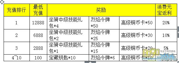 寻宝消费第4-10名的玩家可获得宝藏钥匙*10、烈焰令牌*6、高级铜币卡*10;