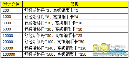 活动期间,只要累积充值对应金额,即可领取相应档次奖励,每个奖励最多只能领取1次。