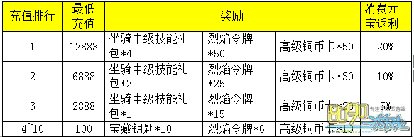 活动期间,全服充值前10的玩家有豪礼相赠,充值前三的玩家更有消费返利;排名1、2、3名分别需要充值达到12888、6888、2888元宝,4-10名需要100元宝。