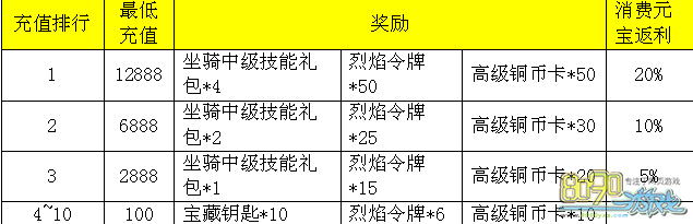 寻宝消费第1名的玩家可获得宝藏钥匙*50、烈焰令牌*50、高级铜币卡*50;