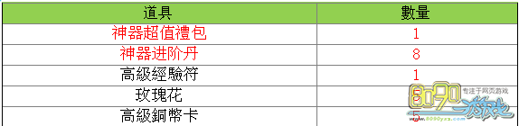 活动期间,每日首次充值任意金额即可获得超值大礼。超值大礼包括:神器超值礼包、神器进阶丹、高级经验符、玫瑰花、高级铜币卡等珍贵道具。