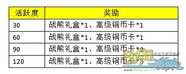 活动期间,每日活跃度达到30、60、90、120可分别获得额外奖励。