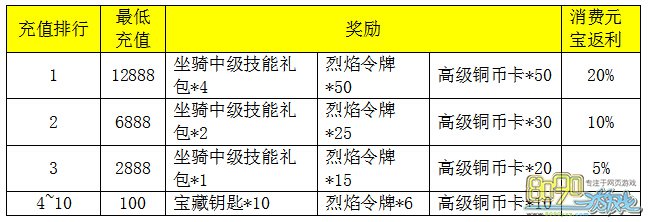 活动期间,全服充值前10的玩家有豪礼相赠,充值前三的玩家更有消费返利;排名1、2、3名分别需要充值达到12888、6888、2888元宝,4-10名需要100元宝。