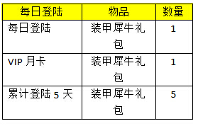 活动期间,每日12、14、16、18、20、22点整点在线随机发送装甲犀牛礼包,所有定时在线玩家都有机会获得,机会人人均等,礼包通过邮件发送,请注意查收。