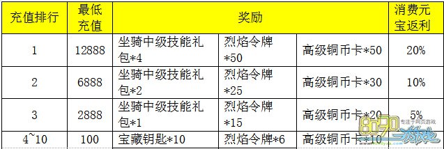 活动期间,全服充值前10的玩家有豪礼相赠,充值前三的玩家更有消费返利;排名1、2、3名分别需要充值达到12888、6888、2888元宝,4-10名需要100元宝。
