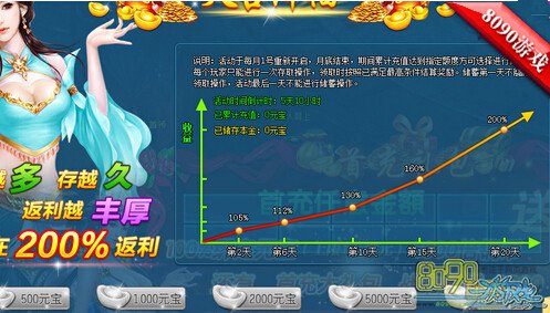 想要在游戏中走的更远,怎么能少得了元宝的鼎立支持呢。8090万界中,每月1号都会开启天宫降福活动,于月底结束,期间累计充值到达指定额度可以选择存元宝,每个玩家只能存一次,但是奖励按最高存的条件结算,在存的第一天和月底最后一天都不能拿元宝。
