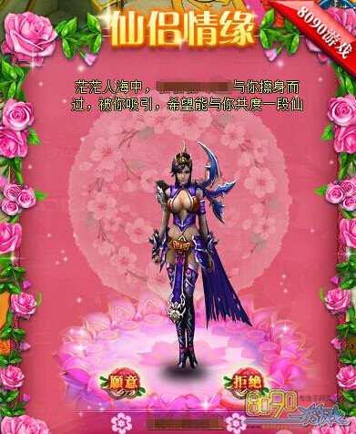 在8090万界中的情缘系统主要分为仙侣情缘和结婚系统两部分,玩家可以于神域的NPC红娘处进去情缘操作。玩家每日都可以主动进行一次仙侣情缘,先到NPC红娘处接受任务,然后邀请一位心仪的对象,心仪对象可以通过 “寻找有缘人”方式来随机寻找,也可以指定自己好友。确定对象后,就对齐发出约会邀请吧,对方收到约会邀请后,如果愿意,那双方将可到红娘处开始一段浪漫的仙侣情缘!
