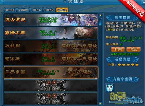 进入8090万界三界争霸的战场后,玩家们将被随机分配到一个阵营,击杀或者帮助本阵营玩家击杀敌对阵营玩家,可增加个人荣誉和阵营积分。护送战旗成功可获得大量荣誉,护送战旗的玩家无法释放技能和攻击其它玩家。