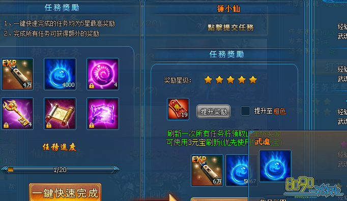 选择快速完成可以直接获得所有奖励,也可以选择使用刷新令来提升品质到橙色,这样可以打怪完成20环,好处是配合经验符打怪效果更佳。