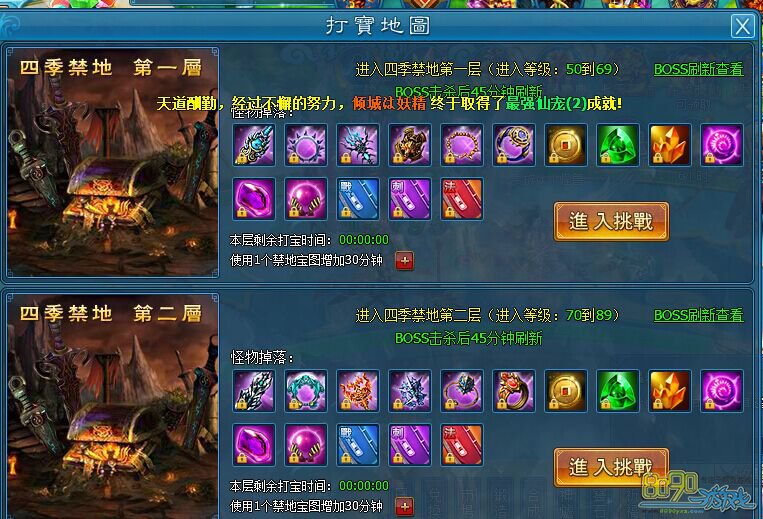 打宝地图共分为4层,需要达到对应等级才能进入,进入打宝地图需要消耗禁地宝图,每个禁地宝图能增加30分钟的打宝时间,打宝地图能产出大量稀有道具!