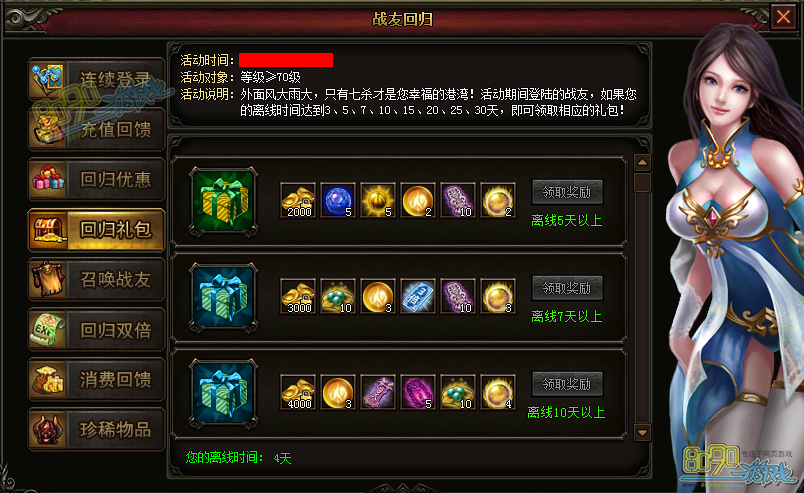 【活动说明】:外面风大雨大,只有七杀才是您的幸福港湾!活动期间登录的战友,如果您的离线时间达到3、5、7、10、15、20、25、30天,即可领取相应的礼包