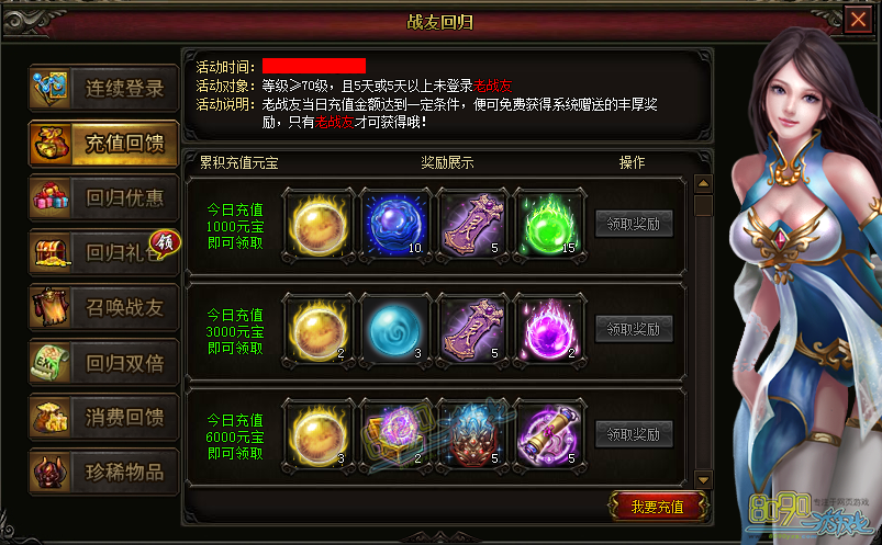【活动说明】:老战友当日充值金额达到一定条件,便可免费获得系统赠送的丰厚奖励,只有老战友才可获得喔!