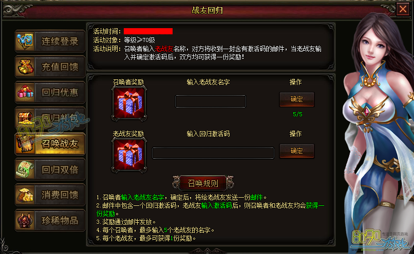 【活动说明】:召唤者输入老战友名称,对方将收到一封含有激活码的邮件,当老战友输入并确定激活码后,双方均可获得一份奖励!