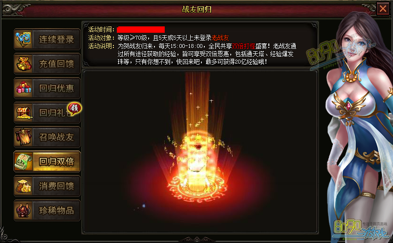 【活动说明】:为贺战友归来,每天15:00-18:00,全民共享双倍打怪盛宴!老战友通过所有途径获取的经验,皆可享受双倍恩惠,包括通天塔、经验爆发珠等,只有你想不到,快回来吧,最多可获得20亿经验喔!