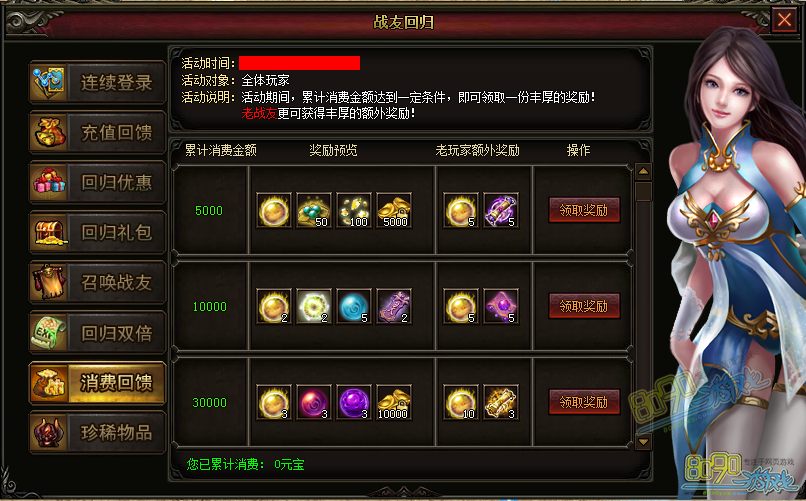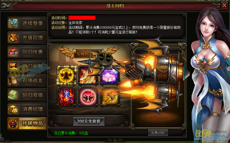 【活动说明】:活动期间,累计消费1000000或者以上,即可免费获得一个限量版珍稀物品!只能领取一个!可消耗少量元宝进行刷新!