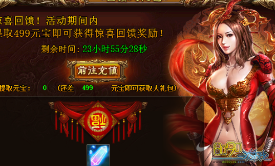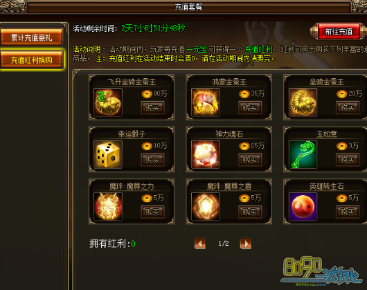 活动详情:活动期间,玩家每充值一元宝可获得一个充值红利,红利可用于购买活动中的丰富道具商品。注意:充值红利在活动结束后清零,请在活动期间内消费完哦。