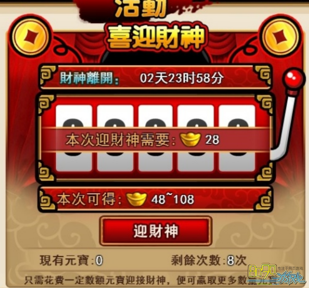 活动期间,玩家固定消耗一定数量的不绑定元宝(288元宝、888元宝、2888元宝、8888元宝)、将可以在幸运财神拉霸活动中拉出比投入元宝数更多的幸运奖励!玩家必须从小到大依次完成拉霸游戏!每个玩家最多只能使用一次相对应的元宝迎接财神哦