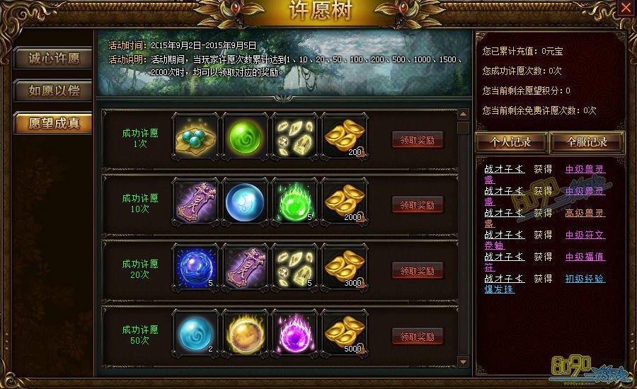 活动说明:活动期间,当玩家许愿次数累计达到1、10、20、50、100、200、500、1000、1500、2000次时,均可以领取相对应的奖励!